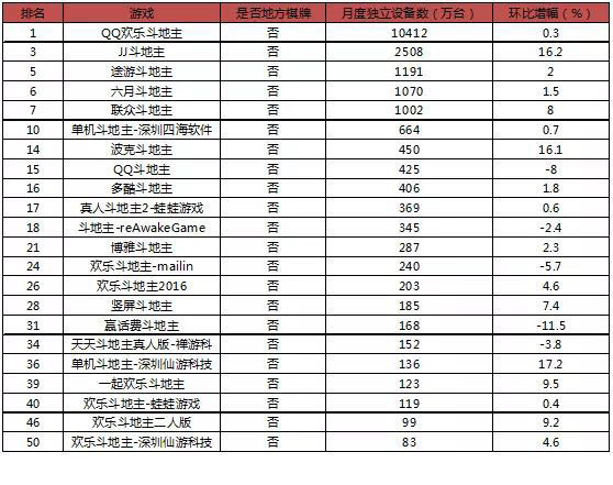 從熱門棋牌游戲下載量中,12款棋牌游戲之中就有4款斗地主游戲的下載量排名靠前,歡樂斗地主的下載量更是遙遙領(lǐng)先于其他棋牌游戲。