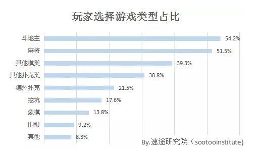 從玩家選擇游戲占比中看出,斗地主以54.2%的比率獲得最受歡迎的棋牌游戲類型。