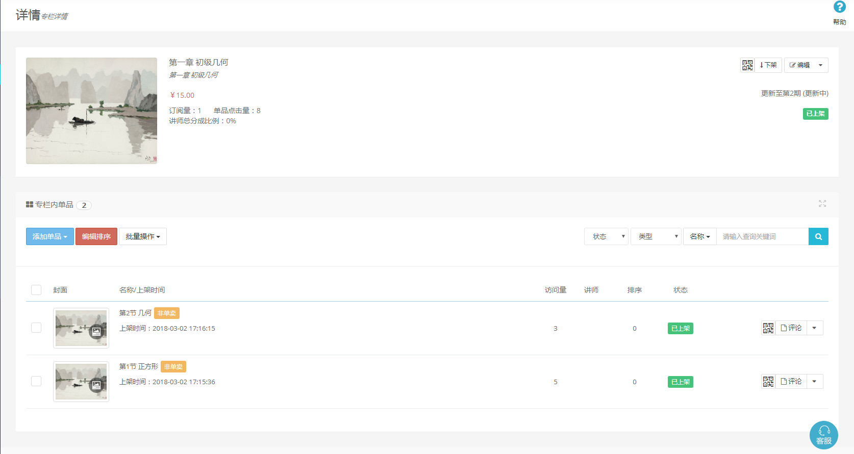 學(xué)拾支持將課程歸類到同一專欄內(nèi),便于用戶進(jìn)行系統(tǒng)性的學(xué)習(xí)。對于學(xué)員來說,一個(gè)完整、全面的課程專欄能夠?yàn)樽约菏∪ニ阉鞑檎艺n程的步驟,極大的提高了學(xué)習(xí)效率;而對于知識(shí)服務(wù)商來說,專欄有助于更好的進(jìn)行課程管理,將同類別的課程集中推廣,加大課程深廣度,以優(yōu)惠折扣打包銷售課程,提升店鋪銷售額。