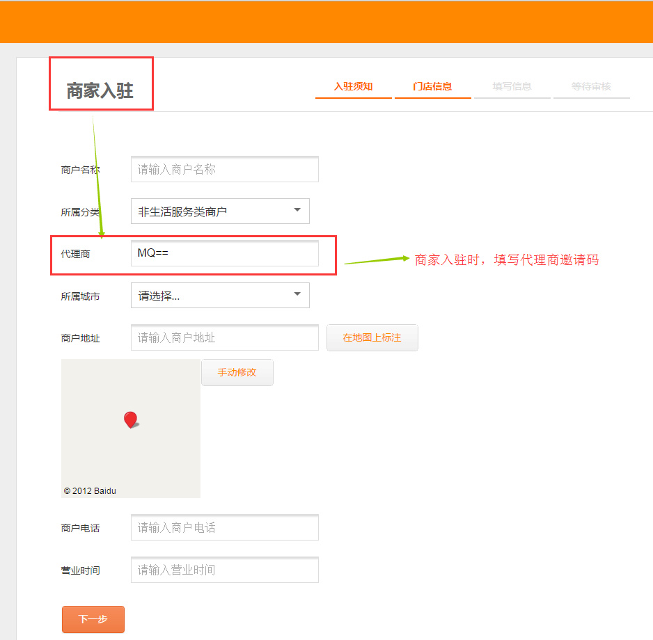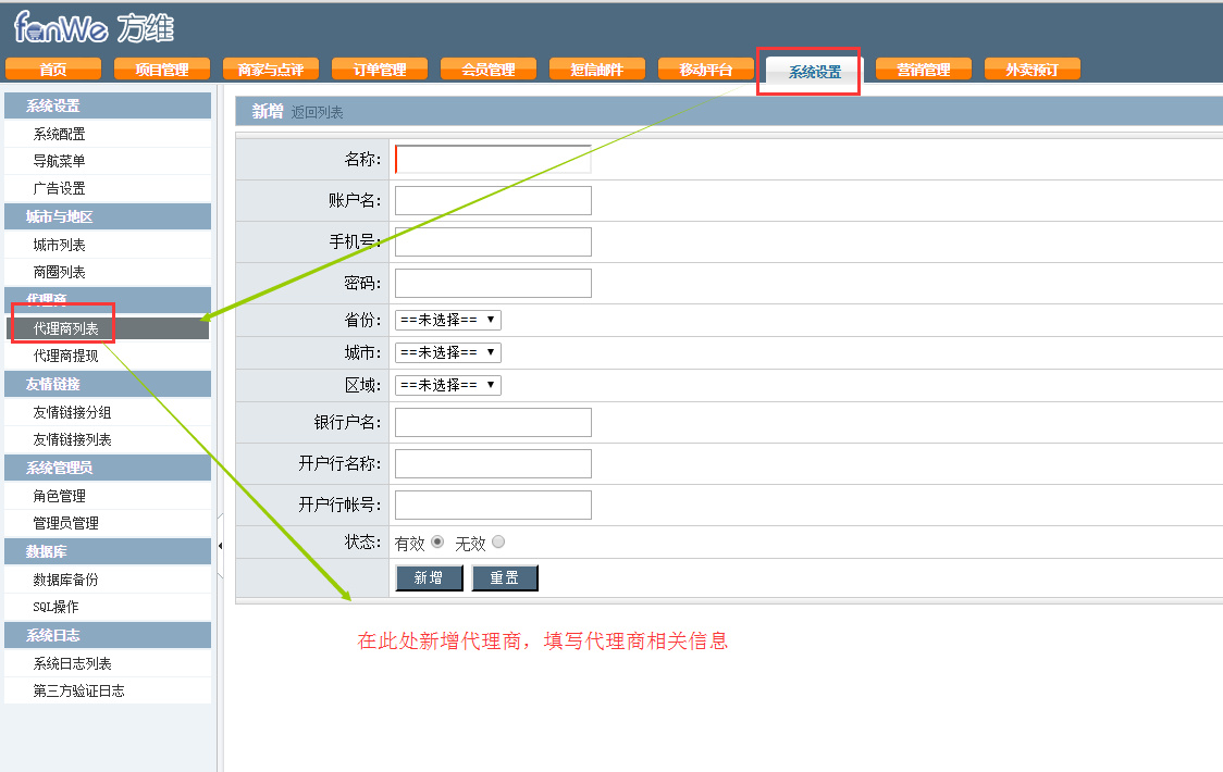 操作流程: 登錄方維城市O2O系統(tǒng)pc端管理后臺(tái) → 點(diǎn)擊系統(tǒng)設(shè)置→代理商列表→新增→編輯代理商的城市、區(qū)域、權(quán)限和各類(lèi)信息→ 完成