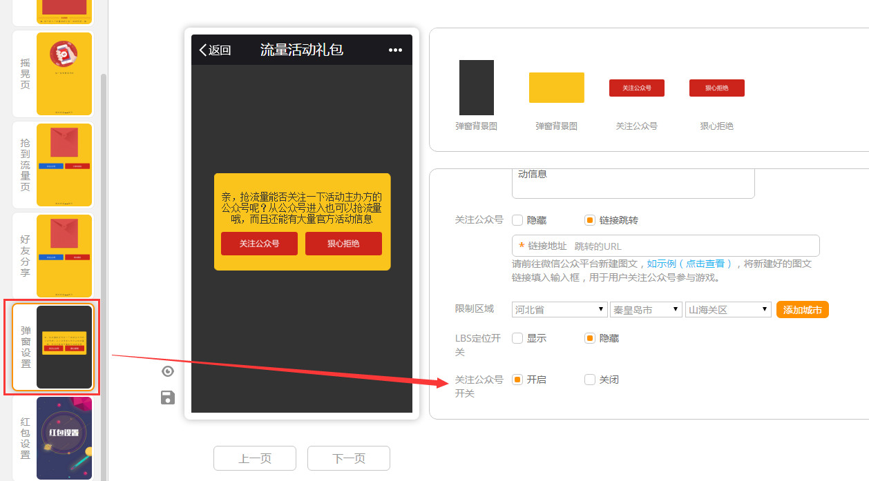 客戶只要進(jìn)入方維流量or語(yǔ)音紅包設(shè)置后臺(tái),在彈窗設(shè)置頁(yè)面下拉設(shè)置項(xiàng),可以看到關(guān)注公眾號(hào)開關(guān)勾選"開啟"單選框,點(diǎn)擊“開啟”并保存即可。客戶在方維流量/語(yǔ)音紅包后臺(tái)設(shè)置完成后,用戶進(jìn)入到活動(dòng)頁(yè)面的時(shí)候就會(huì)自動(dòng)彈出關(guān)注活動(dòng)主辦方的公眾號(hào)提醒,這樣就能增強(qiáng)引導(dǎo)關(guān)注效果,吸引更多的粉絲了呢~