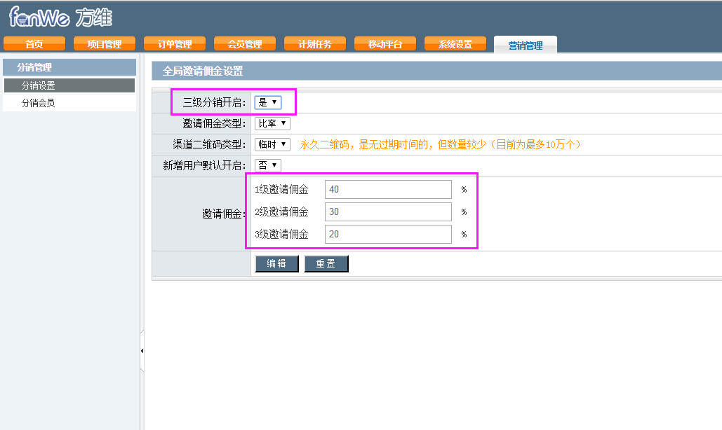 操作步驟: 進入方維人人電商系統(tǒng)商家pc端后臺 → 點擊進入營銷管理界面 →開啟三級分銷 →設(shè)置三級分銷返傭比率 → 完成