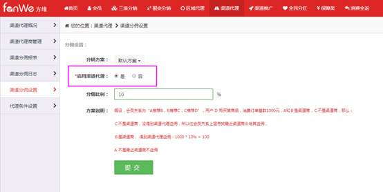 商家只要登錄方維人人電商系統(tǒng)的后臺,選擇啟用渠道代理,再設(shè)置固定的分傭比例,一個金字塔式的渠道代理返傭結(jié)構(gòu)就完美生成了~