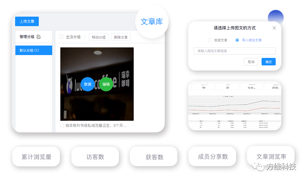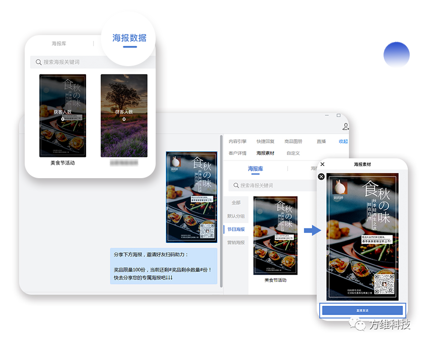 為活動效果提供數(shù)據(jù)依據(jù)。「海報庫」可一步生成員工專屬海報,并可檢測由海報進入的客戶數(shù)據(jù),將活動效果具象化。同時為掃碼參加活動的客戶打上標簽,根據(jù)管理員對不同海報的設(shè)置,客戶將被打上對應(yīng)標簽,便于后期精細化營銷及管理。